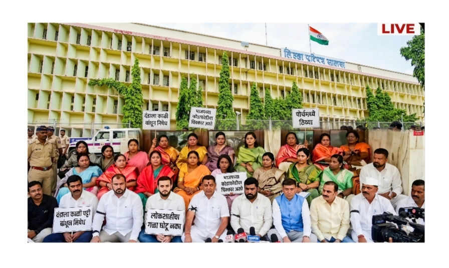 जिल्हा परिषद पोर्चमध्ये जोरदार घोषणाबाजी | दंडाला काळ्या फिती बांधून लोकशाहीच्या 'हत्ये'चा निषेध | 'फोडाफोडी'च्या राजकारणाने