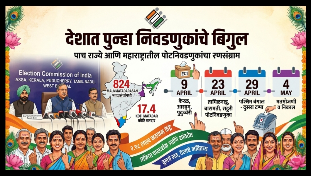 महाराष्ट्रातही वाजले बिगुल: बारामती आणि राहुरीत पोटनिवडणुकीची घोषणा; ४ मे रोजी निकाल.; सत्तासंघर्षाचा बिगुल: आसामपासून तामिळनाडूपर्यंत निवडणुकीची रणधुमाळी सुरू; पाच राज्यांचा रणसंग्राम: १७.४ कोटी मतदार ठरवणार राज्यांचे भवितव्य!