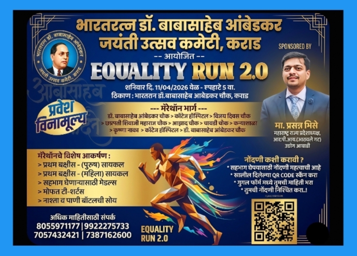 धाव समतेसाठी, धाव आरोग्यासाठी! कराडच्या रस्त्यांवर रंगणार 'ईक्वालिटी रन'चा थरार! निमित्त महामानवाच्या जयंतीचे; लक्ष सामाजिक एकतेचे!विनामूल्य नोंदणी आणि आकर्षणांची लयलूट; शहराच्या मुख्य मार्गांवरून रंगणार मॅरेथॉन